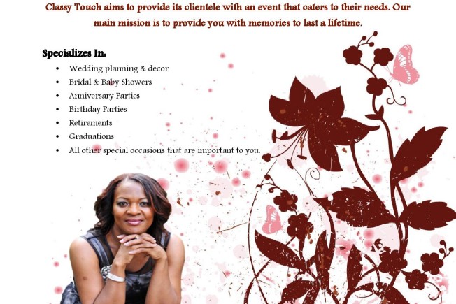 Classy Touch specializes in wedding planning and decor and also provides services for bridal and baby showers, anniversary’s, birthday parties, retirements, graduations and all other occasions that are important to you. No event is too big or small, so rest assured that your event is always attainable.